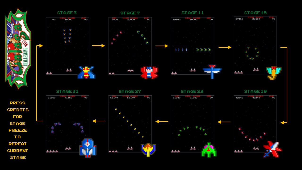 In this romhack of the arcade game Galaga, you play the challenging stages only. It starts with the first challenging stage (stage 3) and plays them all (eight) until the last challenging stage (stage 31) and then repeats the cycle with the first challenging stage ... until forever (you cannot die in a challenging stage ...). You have the option to play the challenging stages with a single fighter (just start a 1 player game) or with a double fighter (just start a 2 player game). Press 'CREDITS' to enable a stage freeze that lets you play the current challenging stage over and over. Press 'CREDITS' again to turn the stage freeze off.